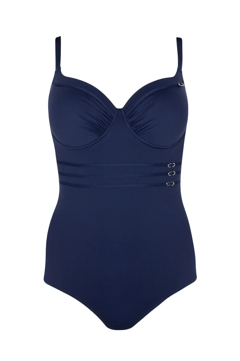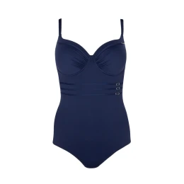 Elegancia v stredomorskom štýle - to sú plavky Monte Carlo 9 S964V1MO9 od značky SELF. Klasický jednodielny strih v tmavomodrom odtieni zvýrazňuje siluetu a poskytuje plné zakrytie a pohodlie. Vystužené košíčky s plnými košíčkami s volánom krásne modelujú poprsie, zatiaľ čo pútavý detail kovového krúžku v páse dodáva jedinečný nádych. Model je vybavený nastaviteľnými a odnímateľnými ramienkami, čo umožňuje nosiť ho viacerými spôsobmi - aj ako plavky bez ramienok. Kvalitná tkanina s elastanom zaručuje odolnosť, pohodlie a dokonalé prispôsobenie.