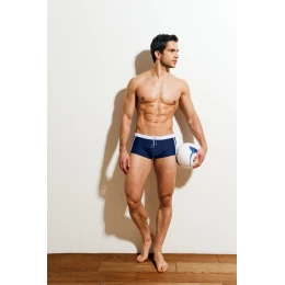Námořnicky modré a bílé sexy pánské plavky. Krátké nohy se svislými dvojitými pruhy vypadají velmi dobře a odkazují na sportovní charakter. Bílé lemování v pase zvýrazní vaše opálení. V horní části je umístěna gumička a provázek, pomocí kterých si můžete nastavit napětí přesně podle svých potřeb. Jedna z nejlepších nabídek výrobce. Cítit se dobře na pláži!
