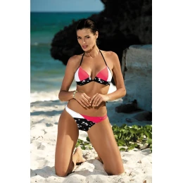 Úžasné plavky v štýle amerického sna. Podprsenka v štýle bikín s vystuženými košíčkami s penovou výplňou nadvihuje a tvaruje prsia a vytvára zmyselný dekolt. Je bez podväzkov a zaväzuje sa vzadu a za krkom. Vyzerá skvele. Farby sú ideálne na pláž, s hviezdičkami v spodnej časti. Spodný diel opticky predlžuje nohy. Dokonale sa prispôsobí podprsenke. Má dobrú výšku (nie príliš nízku), s podšívkou. Zadný diel pekne zvýrazňuje zadoček (pripomína brazílsky štýl a zároveň zakrýva, čo je potrebné).