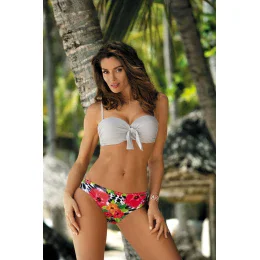 Výnimočné dvojdielne plavky v krásnych farbách. Podprsenka má vystužené košíčky s push up vypchávkami (dostupné vo veľkostiach S, M, L, XL) - vypchávky sa dajú z modelu vybrať. Podprsenka dokonale zbiera prsia do výstrihu a silno ich nadvihuje. Push up nadvihuje prsia o celú veľkosť. Pôvabné "zaväzovanie" v strede modelu pôsobí dojmom. Ramienka sú odopínateľné. Pás sa zapína na pracku. Nohavičky sú veľmi pohodlné, s krásnymi kvetmi. Celok pôsobí veľmi žensky. Vrelo odporúčame. Talianska, veľmi kvalitná látka Carvico Tesutti.