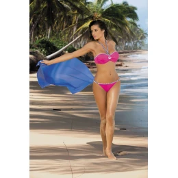 Námořnické plavky jsou hitem každého léta! Původní barvy krásně ladí s opálením. Podprsenka bardotka má vyztužené košíčky, vyztužené spodní a boční kosticí. Velmi dobře sbírá prsa, přibližuje je k sobě a tvaruje je.K velikostem S, M a L jsou navíc přidány odnímatelné push-up vycpávky, které opticky zvětšují poprsí. Hladká podprsenka, v horní části zdobená žebrovaným lemem. Uprostřed pohárů je umístěna brož, která imituje námořnické kormidlo a kotvu. Všechny zdobené třpytivými diamanty. Brož se zapíná pomocí spínacího špendlíku a v případě potřeby je volně odnímatelná.Podprsenka se zapíná na sponu, navíc ji lze zavázat za krkem nebo vytáhnout. Součástí jsou silněji vykrojené kalhotky s tenkými ramínky na bocích - ramínka jsou volně nastavitelná. Hladký, neprůhledný, pružný. Celkovou přitažlivost dodává žebrovaný lem.