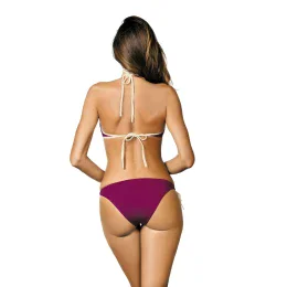 Hladké dvoudílné plavky ušité z italské látky. S ramínky ve výstřihu. Ve skvělých barvách. Svůdné a ženské. Podprsenka je zespodu vyplněna speciální pěnou a obohacena o push-up výplň - dokonale shrnuje prsa do výstřihu, nadzvedává je a opticky zvětšuje. Uprostřed je brož. Podprsenka se zavazuje na zádech i za krkem. Spodní díl je také vázaný na obou stranách, velmi pohodlný. Vynikají pěknými bižuterními obručemi po stranách. Velmi půvabně zdobí boky.