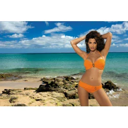 Jedny z najkrajších plaviek tohto leta! Sexi strih, módna farba sú najväčšími prednosťami týchto plaviek. Podprsenka typu balconette, zdobená efektnou zlatou brošňou, ktorá dokonale ladí s opálením. Podprsenka dokonale tvaruje prsia, čím im dodáva zvodný tvar. Má kostice - vďaka nim je poprsie nadvihnuté a podopreté. Má jedno, odopínateľné ramienko, ktoré sa dáva za krk. Pre veľkosti S, M, L, XL sú pridané push-up vypchávky (dajú sa vybrať). Podprsenka sa zaväzuje vzadu, takže každá žena si môže veľkosť prispôsobiť podľa svojich predstáv.