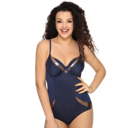 Tieto jednodielne plavky sú vyrobené z vysokokvalitného úpletu a vyznačujú sa kombináciou nevýraznej tmavomodrej farby a jemnej lesklej potlače, ktorá splní očakávania aj tých najnáročnejších žien.