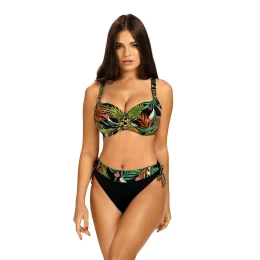 Dvojdielne plavky. Podprsenka s kosticami s kvetinovým vzorom, neodnímateľné a nastaviteľné ramienka. Súprava obsahuje: klasický pevný spodný diel, vzorovaný, nariasený pás.
