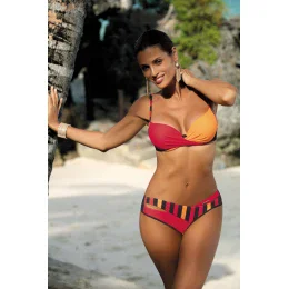 Veľmi módne dvojdielne plavky v skvelých, šťavnatých farbách. Podprsenka s vystuženými košíčkami, kosticami a priloženými push up vypchávkami (k dispozícii od veľkosti S do L vrátane) - zhromažďuje prsia do dekoltu, nadvihuje ich a zväčšuje. Push up s možnosťou vytiahnutia z podprsenky. Nastaviteľné ramienka, obvod so zapínaním. Bude vám to slušať! Farby vyzerajú skvele na opálenom tele. Spodný diel s bočnými rozparkami, so vzorovaným pásom, pohodlný.