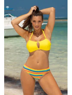 Podprsenka s kosticami a vystuženými košíčkami, ktoré sú obohatené o zabudovaný permanentný push-up, dokonale nadvihuje, tvaruje a opticky zväčšuje prsia. Je ideálna pre malé a stredne veľké prsia. Vzorované zdobenie vyzerá na slnku nádherne. Košíčky sú v spodnej časti mierne nariasené. Ramienka sú tenké, dĺžkovo nastaviteľné, obvod je elastický a zapínanie na pracku je pohodlné. Spodná časť plaviek s ozdobným zvrškom je veľmi pohodlná. Predná časť je pohodlne podšitá.
