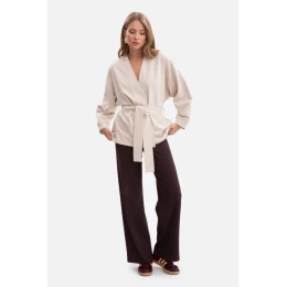 90% bavlna 10% elastan MATERIÁL Materiál: hladký mikinový úplet, spodní strana smyčková, hmotnost 260 g PODROBNOSTI O PRODUKTU Zapínání: otevřené sako, zavazování v pase na poutka na pásek Límec: žádný Kapsy: žádné Rukávy: dlouhé, široké, zakončené manžetami Podšívka: žádná Model: B297 Navrženo a vyrobeno v Polsku z látky vyrobené v Polsku Modelka na fotografii měří 171 cm a má na sobě velikost S/M STYL A STŘIH Střih: volný, otevřený - kimono s páskem Tvar: mírně nadměrný, v pase nastavitelný páskem Délka: do boků