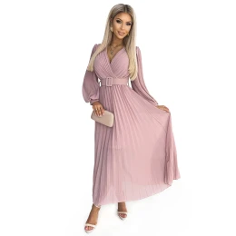 KLARA Plisované dámské šaty v pudrově růžové barvě s výstřihem a opaskem model 18330495 - numoco basic