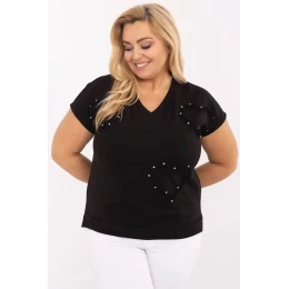 Táto dámska bavlnená blúzka plus size v ležérnom štýle je ideálnou ponukou na každý deň, ako aj do práce. Je vyrobená z mäkkej a na dotyk príjemnej bavlny s prídavkom elastanu, poskytuje pohodlie pri nosení a skvele sa prispôsobí postave. Model štandardnej dĺžky s krátkymi rukávmi a ženským výstrihom do V, ktorý jemne zvýrazňuje krk. Pútavá aplikácia v tvare srdca na prednej strane, zdobená trblietavými zirkónmi, dodáva blúzke elegantný a zároveň jemný šarm. Ideálna na každodenné nosenie, bude sa hodiť k džínsom, ako aj ku klasickým nohaviciam alebo sukni. Je univerzálna, pohodlná a má charakter, je ideálna do práce aj na neformálnejšie stretnutia.