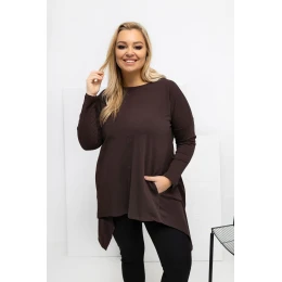 Asymetrická blůza ve velikosti plus ve stylu casual je ideální nabídkou na každý den, kombinující pohodlí s módním vzhledem. Model s kratší přední částí a delším zadním částí jemně zúží postavu a zajišťuje volnost pohybu. Hladký střih činí z blůzy univerzální kousek, který se snadno stylizuje, skvěle se hodí jak k džínům, tak k legínám. Vyrobená z vysoké kvality bavlny s přídavkem elastanu, je měkká, prodyšná a pružná, díky čemuž se dokonale přizpůsobuje postavě. Dlouhý rukáv a klasický, kulatý výstřih zdůrazňují její každodenní charakter. Praktickou výhodou jsou kapsy skryté v bočních švech, které přidávají funkčnost a moderní nádech. Blůza nemá zapínání, což zvyšuje pohodlí nošení a zdůrazňuje její volný, uvolněný styl.