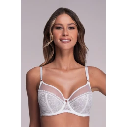 Biustonosz AV 1396 w kolorze białym to propozycja dla kobiet ceniących świeżość, wygodę i kobiecy styl. Wykonany z miękkiej siateczki i subtelnej koronki w kwiatowy wzór, pięknie podkreśla linię biustu, zachowując lekki, romantyczny wygląd. Model posiada pełniejszą miskę o miękkiej konstrukcji, dzięki czemu doskonale sprawdza się także u kobiet z większym biustem. Delikatna forma misek bez dodatkowego usztywnienia pozwala na naturalne ułożenie piersi, a fiszbiny zapewniają stabilne podtrzymanie. Uroku dodaje dekoracyjny pasek nad miseczkami i biżuteryjny detal na mostku. Tył z gładkiego tiulu, zapięcie na haftki oraz regulowane ramiączka gwarantują wygodę i dopasowanie. To bielizna, która łączy komfort, lekkość i klasyczną elegancję – idealna na co dzień, również jako element stylizacji ślubnej.