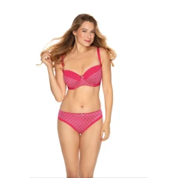 Krásna, ženská, intenzívne ružová, vystužená podprsenka s plnými košíčkami. Model, ktorý dobre zbiera, tvaruje a nadvihuje prsia a vytvára zvodný dekolt. Vrchná časť je hladko zakončená, spodná časť s jasnou, kvetinovou potlačou. Vysoký stred poskytuje dobrú oporu poprsiu. Košíčky sú plne vystužené, obvod je mäkký a dobre prilieha k telu. Zloženie: 43% polyamid, 30% polyester, 16% bavlna, 7% elastan, 4% polyuretán.