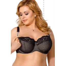 Mäkká podprsenka s kosticami pre dojčiace ženy.Košíčky modelu sú vyrobené z čiernej bodkované sieťoviny a sú podšité jemnou bavlnou. Hornú líniu zdobí efektné čierna čipka. Ramienka majú zapínanie typu Quick Clic. Vďaka tomu je možné odopnúť a zapnúť jednou rukou, čo uľahčuje dojčenie dieťaťa.