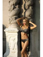 Podprsenka, ve které se budete okamžitě cítit sebevědomě a smyslně! Na horní linii je kompozice z jemné krajky zdobená inspirujícími výšivkami. Vše je pokryto exkluzivním tylem. Mezi košíčky byla umístěna saténová mašle se svitkem ve tvaru hvězdy. Krémové boky a záda byly potaženy rafinovanou černou síťovinou. Model s podšitím ve spodní části a na bocích velmi dobře stahuje poprsí. Košíčky dokonale tvarují a zvedají prsa, což působí velmi přirozeně. Vzhled doplňují ozdobné, nastavitelné a neodnímatelné pásky zakončené hravými saténovými mašlemi.