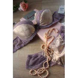 Mimořádně romantická podprsenka s kosticemi, která působivě pozvedne a opticky zvětší poprsí. Zajímavá kombinace odstínů: světle fialová a pudrově růžová. Svůdný vzorovaný satén dokonale ladí s vyšívanou krajkou. Výhodou jsou odnímatelné ramenní popruhy a odnímatelné push up polštářky. Půvab dodává perlový přívěsek umístěný mezi šálky. O třídu výš.