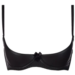 | Rozkošná a svůdná černá podprsenka V-8401 peek-a-boo upoutá pozornost strukturovaným materiálem - měkkým latexem s matným povrchem a neodnímatelnou mašlí mezi košíčky. Podprsenka má zapínání na háčky a oka. Komplet se sukní V-8409, tangy V-8348 a řetízkem V-8406. |
