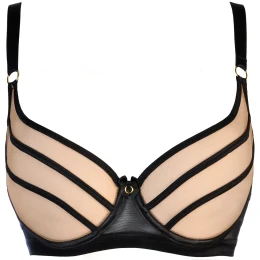 Poutavá podprsenka s béžovými průsvitnými košíčky. Geometrický vzor tenkých černých ramínek zvýrazňuje přirozenou krásu poprsí. Zlaté detaily dodávají eleganci. Podprsenka má zapínání na háčky a očka a ramínka jsou nastavitelná a neodnímatelná, aby se přizpůsobila vaší velikosti.