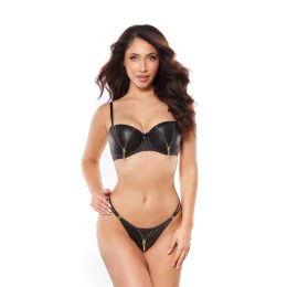 Latexová podprsenka se zlatými ozdobnými zipy je jistě dvouúčelovým modelem, na jedné straně ji můžete nosit každý den jako nevšední soupravu spodního prádla a na druhé straně ji lze využít pro speciální úkoly, skvěle se hodí na společné večery a párty. Model má vnitřní vycpávky, navíc zajištěné drátky pod košíčkem pro stabilitu a zabránění posunu podprsenky. Má nastavitelná, neodnímatelná ramínka a dvouřadé nebo třířadé zdobení háčky a očky ve zlaté barvě.