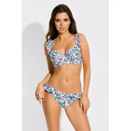 Miękki biustonosz kąpielowy, miseczki z falbanką naszytą w górnej części, dół lekko marszczony, ramiączka regulaowane, zapięcie na plecach.