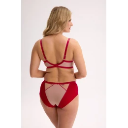 Zmysłowy biustonosz typu semi soft w intensywnie czerwonym kolorze to propozycja dla kobiet, które cenią elegancję i wyrafinowany wygląd. Miękkie miseczki z dolną częścią delikatnie usztywnioną gwarantują doskonałe podtrzymanie i naturalne wyeksponowanie biustu. Górna część miseczek wykonana jest z transparentnego tiulu, subtelnie zdobionego kwiatową koronką, co nadaje bieliźnie lekkości i kobiecego wdzięku. Na mostku znajduje się mała biżuteryjna zawieszka, która dodaje całości luksusowego charakteru. Regulowane ramiączka i klasyczne zapięcie na haftki zapewniają idealne dopasowanie do sylwetki.
