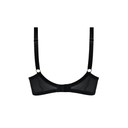 Tato měkká podprsenka určená pro velká prsa láká svou smyslností a originálním designem. Jemná černá krajka byla zvýrazněna ozdobnými ramínky, která na výstřihu tvoří nápadnou síť a dodávají celku dravý a zajímavý charakter.