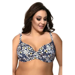 Plavky s jemnou kvetinovou potlačou sú vždy dobrou voľbou na horúce letné dni.Model SK115 je dokonca posiaty bielymi kvetmi, čo z neho robí mimoriadne ženské plavky.Mäkké košíčky podprsenky pevne podopierajú prsia a dodávajú im zvodný oválny tvar.Spodný diel s kvetinovým volánom zakrýva nedokonalosti.