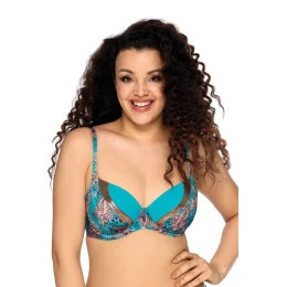 Model SK 141 prináša poriadnu dávku exotického letného štýlu vďaka plne vystuženým košíčkom, elastickému pásu a zodpovedajúcim ramienkam, ktoré zhromažďujú, nadvihujú a podporujú prsia, takže dekolt vyzerá obzvlášť príťažlivo. Bohatý úplet s potlačou rastlín je dokonale zladený s kovovými vložkami a tyrkysovým lemovaním a nové logo AVA dokonale zapadá do rajského pozadia.