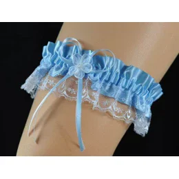 Modrý saténový a biely krajkový podväzok zdobený jemným perlovým kvetom.