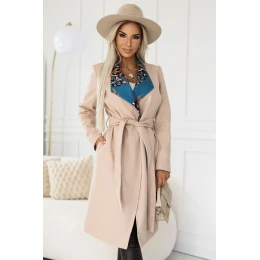 Poľský béžový kabát s viazaním a štýlovými vložkami na golieri