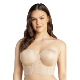 Półgorset w kolorze beżowym, konstrukcja bardotki z przedłużonym obwodem.Usztywnione formowane miseczki, pionowe fiszbiny zapobiegające marszczeniu się boków. Z tyłu czterostopniowe zapięcie na haftki. Model bez ramiączek, z przodu wstawki z delikatnej koronki. Silikonowa taśma podtrzymująca górną część miseczki, doskonale podtrzymuje duży biust.