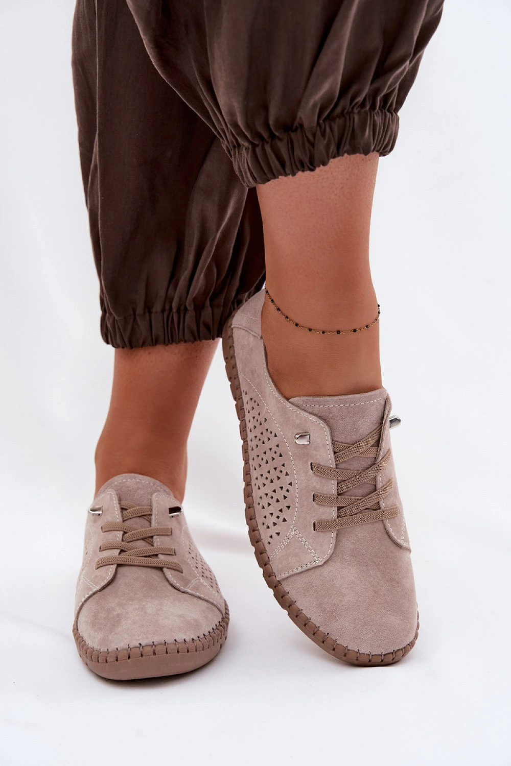 Dámské polobotky vyrobené z přírodního semiše jsou stylovým a pohodlným návrhem na každý den. Materiál vysoké kvality dodává obuvi elegantní vzhled a zároveň zajišťuje pohodlí při nošení. Model se vyznačuje průsvitným vzorem, který nejen dodává lehkost a originální charakter, ale také zlepšuje prodyšnost, ideální na teplejší dny. Elastické gumové šněrování usnadňuje obouvání a zajišťuje dobré přizpůsobení noze. Vnitřek boty je vybaven měkkou vložkou typu Comfort Shoes, která zvyšuje pohodlí i při dlouhodobém nošení. Dekorativní stehy zdůrazňují pečlivé provedení a zaoblené špičky zaručují volnost pro prsty. Jedná se o skvělou volbu pro ženy, které oceňují spojení pohodlí, kvality a módního vzhledu.