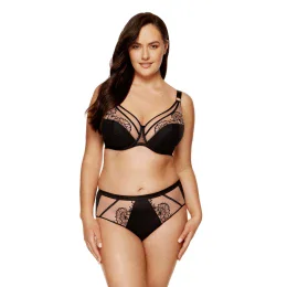 Elegantná podprsenka v čierno-béžovej farbe. Spodná časť košíčkov je vyrobená z tenkej korzetovej peny potiahnutej jemným tylom a vrchná časť zo sieťoviny vyšívanej výšivkou, vďaka čomu sa podprsenka dokonale prispôsobí tvaru pŕs. Je ideálna na asymetriu. Spodná časť košíčkov je z vnútornej strany podšitá bavlnou OEKO-TEX, takže sú jemné k pokožke. Zlaté detaily dodávajú podprsenke eleganciu, zatiaľ čo zvislé bočné veľryby stabilizujú jej obvod. Podprsenka bola navrhnutá a ušitá v Poľsku.