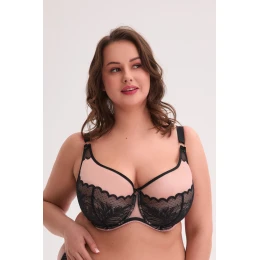 Vychutnajte si modernú eleganciu v tejto čierno-ružovej polomäkkej podprsenke s hlbokými košíčkami. Tento model je dokonalou kombináciou jemnosti a opory - bledoružový základ košíčkov kontrastuje s čiernou výšivkou a vytvára fascinujúci optický efekt. Hlboké košíčky krásne zhromažďujú a tvarujú poprsie a mäkká spodná časť bola bez problémov skombinovaná so širokými, stabilnými ramienkami, ktoré zabezpečujú pohodlie pri nosení počas celého dňa. Model vytvorený pre ženy s plnším poprsím, ktoré sa nechcú vzdať luxusu a zmyselnosti.