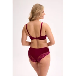 Biustonosz semi soft w odcieniu głębokiego bordo to propozycja dla kobiet, które cenią sobie elegancję i perfekcyjne dopasowanie. Konstrukcja tego modelu została dopracowana z myślą o maksymalnym komforcie i efektownym wyglądzie – ramiączko płynnie łączy się z usztywnioną częścią miseczki, co gwarantuje stabilne podtrzymanie biustu. Misternie haftowana koronka delikatnie okala miseczki i zmysłowo wyciąga się aż na ramiączka, tworząc luksusowy efekt wizualny. Ten model doskonale sprawdzi się zarówno na co dzień, jak i na wyjątkowe okazje – zawsze wtedy, gdy chcesz czuć się pięknie i pewnie siebie.