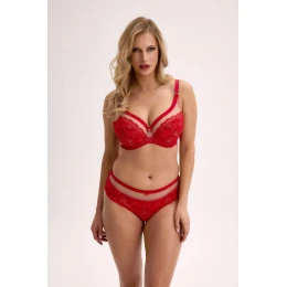 Biustonosz MIRELLA w konstrukcji SS5 (1058 sonia) w zmysłowej, ognistej czerwieni. Charakterystyczna, nieusztywniona górna część miseczki została wykonana z transparentnej siatki, która lekko opina biust i nadaje całości delikatności. Dolna część miski wzmocniona jest pianką gorseciarską i pokryta elegancką koronką, która subtelnie ozdabia i modeluje piersi. Konstrukcja SS5 doskonale zbiera i unosi biust, podkreślając jego naturalny kształt, a przy tym zapewnia komfort nawet podczas dłuższego noszenia. Detale w postaci czerwonej lamówki i paseczków przy dekolcie dodatkowo akcentują seksowny charakter modelu. To idealna propozycja na specjalne okazje, jak i do codziennych, odważnych stylizacji.