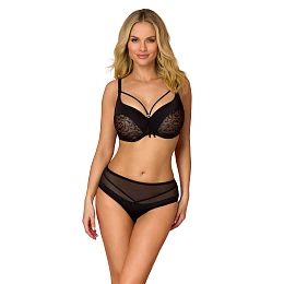 Podprsenka vyrobená podľa kópie známeho nemeckého výrobcu. Misky nemajú zvislé švy. Z vnútornej strany sú misky úplne hladké a mäkké, čo zaisťuje dokonalé pohodlie pri nosení. Zvonku je misa zdobená španielskym plénom a čiernou pleteninou. Dodatočná nastaviteľná ozdoba na poprsie v podobe pásikov s bižutérnym ornamentom. Stred, boky a chrbát z čierneho šifónu (bez bočných veľrybích kostíc). Upravuje a tvaruje poprsie a odstraňuje drobné asymetrie pŕs. Nastaviteľné, neodnímateľné ramenné popruhy.