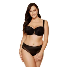 Vystužená podprsenka v čiernej farbe. Misky z tenkej korzetovej peny potiahnuté z vonkajšej strany hladkou pleteninou. Medzi šálkami je malá ozdobná mašľa. Vnútorná časť košíčkov je potiahnutá bavlnou OEKO-TEX, takže sú jemné k pokožke. Zadná časť podprsenky je vyrobená z elastického tylu. Zvislé bočné ramienka s veľrybími kosťami stabilizujú obvod podprsenky. Podprsenka bola navrhnutá a ušitá v Poľsku.