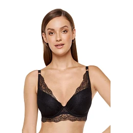 Podprsenka s pevnými košíčkami v čiernej farbe. Úplne nový plunge dizajn s hlbokým stredom, ktorý jemne nadvihuje a zhromažďuje poprsie. Pevné košíčky z korzetovej peny potiahnuté čipkou s jemne lesklým kvetinovým vzorom. Vnútorná časť košíčkov potiahnutá bavlnou s certifikátom OEKO-TEX, vďaka čomu sú šetrné k pokožke. Zadná časť podprsenky je vyrobená z čipkovej tkaniny. Zvislé bočné kostice stabilizujú obvod podprsenky. Podprsenka bola navrhnutá a ušitá v Poľsku.