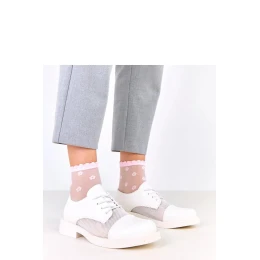 Šnurovacie poltopánky s ozdobnou vložkou zo sieťoviny na zvršku sú štýlovou kombináciou klasického a moderného dizajnu. Sú vyrobené z kvalitnej ekokože, vynikajú okrúhlou špičkou a módnym detailom v podobe vložky zo sieťoviny, ktorá im dodáva ľahkosť a originálny charakter. Model je osadený na nízkom, stabilnom podpätku s dĺžkou 3 cm, ktorý zaručuje pohodlie pri každodennom nosení. Šnurovanie umožňuje ideálne prispôsobenie sa nohe a vložka z prírodnej kože zaručuje pohodlie a priedušnosť počas celého dňa. Sú to jedinečné poltopánky, ktoré dokonale zapadajú do moderného mestského štýlu, ideálne do práce aj na každý deň.