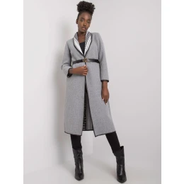 Šedý melanžový kabát s vreckami a opaskom.
