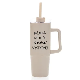 PRÁCE NEUTEČE, KÁVA VYSTYDNE! - béžový cestovní termohrnek s průhledným víčkem 900 ml