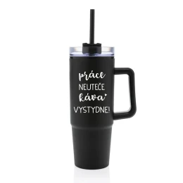 PRÁCE NEUTEČE, KÁVA VYSTYDNE! - černý cestovní termohrnek s průhledným víčkem 900 ml