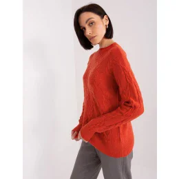 Tmavooranžový sveter s kockami a okrúhlym výstrihom.