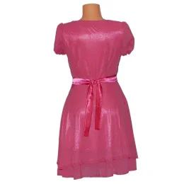 dámske šifónové šaty skvelé na večierok, ples alebo maturitný ples. Sukňa je strihaná do tvaru písmena A a skladá sa z dvoch vrstiev, ktoré sa v spodnej časti neprekrývajú, čo vytvára dojem okvetných lístkov. Rukávy sú krátke, balónového strihu.šaty majú na boku zips na pohodlné obliekanie. Šaty sa dajú v páse vybaviť saténovou stuhou, ktorá je súčasťou balenia. Stuha opticky pretína šaty a zároveň dáva vyniknúť ženskej siluete.krásne a romantické šaty na každú spoločenskú udalosť.