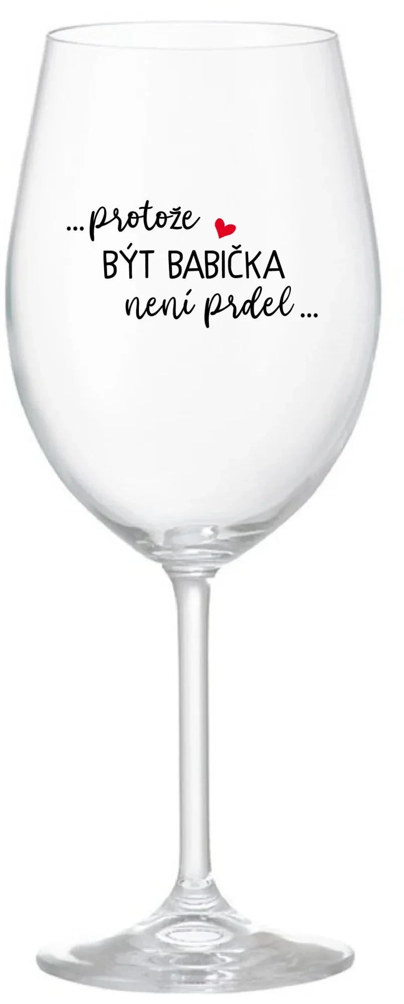 Vinná čirá sklenice s originálním motivem ...PROTOŽE BÝT BABIČKA NENÍ PRDEL.. je krásným a osobitým dárkem, které ale využijete i Vy sami třeba ve chvílích, kdy si budete chtít zpříjemnit náročný den. Tyto originální vinné sklenice jsou totiž nejen pro výjimečné události, ale i pro běžné večery, které si chcete zpříjemnit sklenkou dobrého vína. Jistě proto potěší každého milovníka vína, i toho, kdo si umí svůj život vychutnat plnými doušky.parametre
