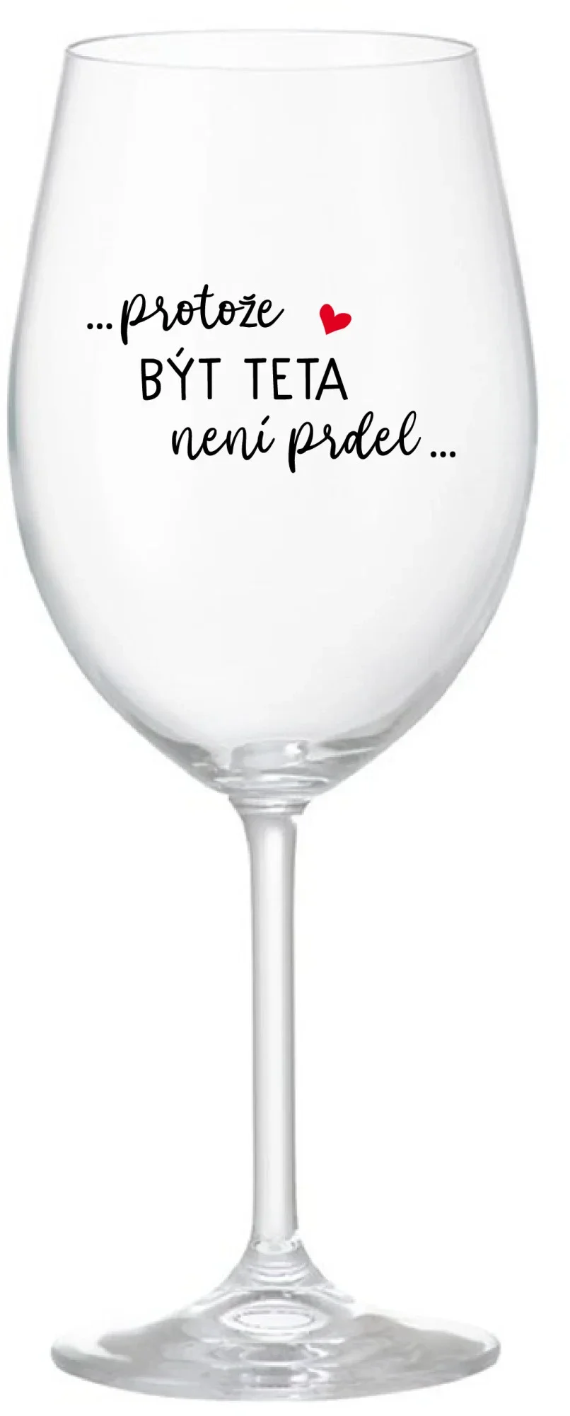 Vinná čirá sklenice s originálním motivem ...PROTOŽE BÝT TETA NENÍ PRDEL... je krásným a osobitým dárkem, které ale využijete i Vy sami třeba ve chvílích, kdy si budete chtít zpříjemnit náročný den. Tyto originální vinné sklenice jsou totiž nejen pro výjimečné události, ale i pro běžné večery, které si chcete zpříjemnit sklenkou dobrého vína. Jistě proto potěší každého milovníka vína, i toho, kdo si umí svůj život vychutnat plnými doušky.parametre