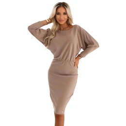 Šaty jsou vyrobeny z příjemné na dotek elastické tkaniny s jemným žebrovaným vzorem. Tkanina pěkně drží tvar, aniž by příliš obepínala tělo nebo prosvítala. Odstín moka mousse dodává stylingu eleganci a jemnou krémovou hřejivost. Navrženo společností Numoco, vyrobeno v Polsku.