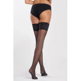 Dámské samodržící punčochy Kama Bas Bleu s 15cm širokým krajkovým lemem, který je ukončený silikonovými proužky, díky kterému punčochy dobře drží a nekloužou. 20 DEN. Materiálové složení: 86% polyamid,14% elastan. Barva: černá, bílá, natural. Velikost: S, M, L.