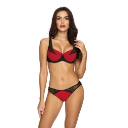 Elegantná push-up podprsenka vyrobená z kombinácie červenej pleteniny s jemnou čiernou bodkovanou potlačou a elegantnej čipky, ktorá bola vynechaná pozdĺž ramienok, aby pôsobila zmyselne. Čipkový mostík, vyberateľné vypchávky, mašlička medzi košíčkami s príveskom. Nastaviteľné, neodnímateľné, predĺžené čipkované ramienka. Zadná časť z elastickej sieťoviny, zapínanie na háčik a očko.